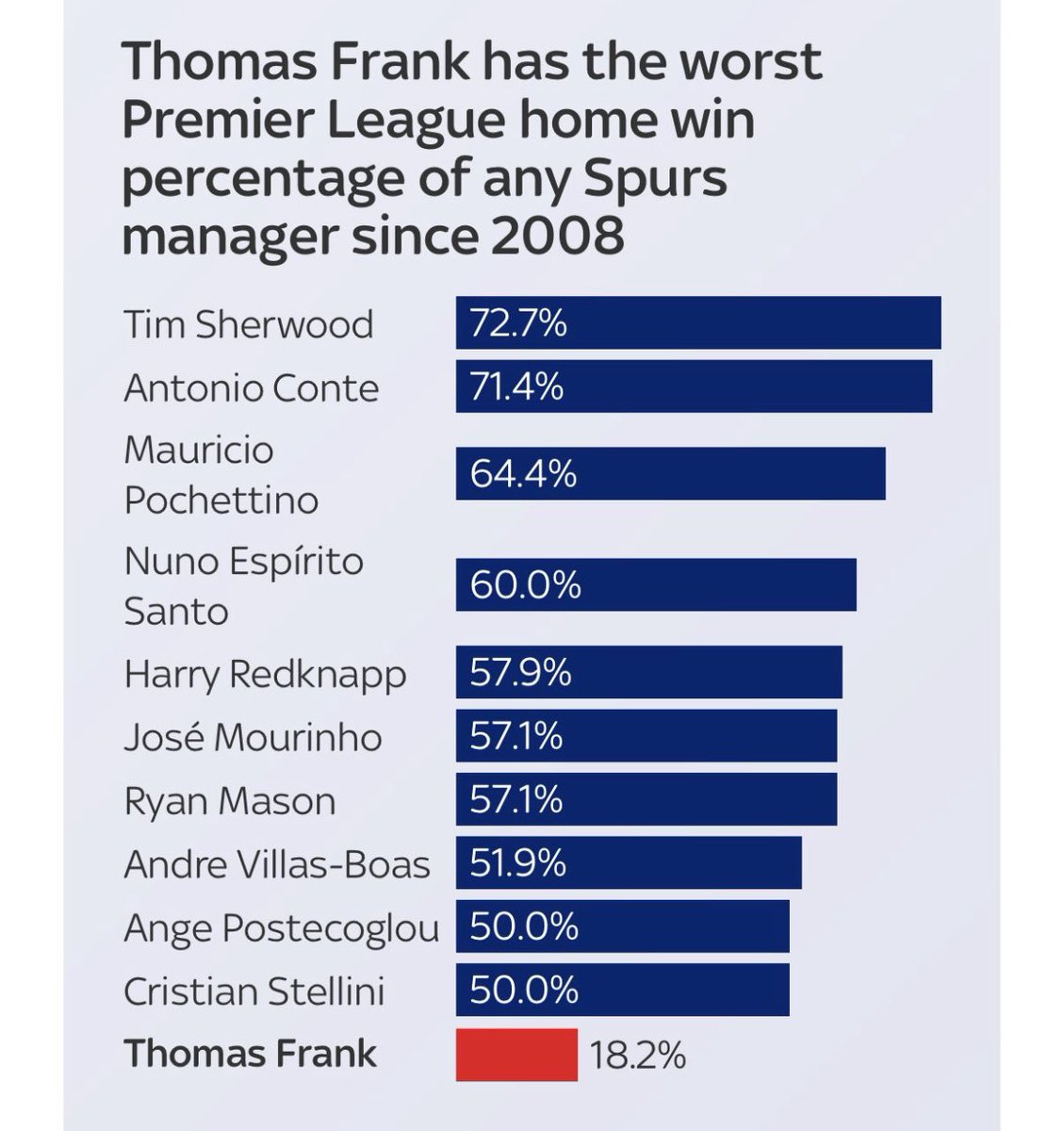 Frank currently has the lowest home win percentage of any Tottenham manager. He has an 18% win rate at home since taking over at the North London club. That is simply unacceptable, and it would not be a surprise if not decided to sack him.